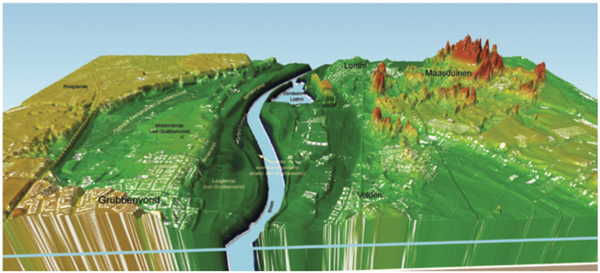 De Maas is een prachtige rivier. Maar ze brengt bij tijd en wijle onze veiligheid in gevaar door hoge waterstanden. Dat maken we in Grubbenvorst van dichtbij mee. Nederland zet al jarenlang haar meest deskundige mensen aan het werk om voor dat probleem een oplossing te vinden. Dat leverde onder andere uitgebreide studies op naar het ontstaan en het gedrag van de rivier. Met elke studie groeide het besef dat wij in een uniek landschap wonen. Populair gezegd: ‘Reis de wereld maar af, dit vind je ergens anders niet.’ Dat unieke zit hem erin dat in het landschap nog altijd duidelijk zichtbaar is hoe de Maas gedurende miljoenen jaren in een afwisseling van dooi- en ijstijden telkens nieuwe wegen vond in de sterk wisselende bodem. Een stijgende bodem ook nog, door het verschuiven van diepe aardlagen.